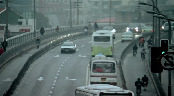 这是谢琴在大桥上骑车的一个镜头。人很渺小。