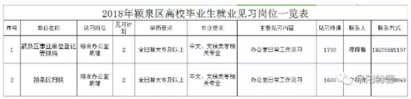 为提高高校毕业生就业能力,拓宽高校毕业生就业渠道,颍泉区妇联、颍泉区事业单位登记管理局等两家见习单位拟开发高校毕业生就业见习岗位4个,吸收2017、2018年度离校未就业的高校毕业生参加就业见习。