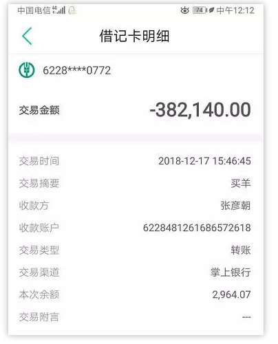 由于一时大意点错转款对象,382140元购羊款汇入去年的合作伙伴,河北省保定市唐县黄石口乡张某朝的账户上。