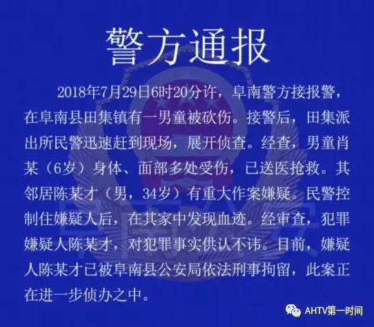 从阜南县公安局官方微博发布的警方通报中可以看到,7月29日6时20分许,阜南警方接报警,在阜南县田集镇有一男童被砍伤。接警后,田集派出所民警迅速赶到现场,展开侦查。